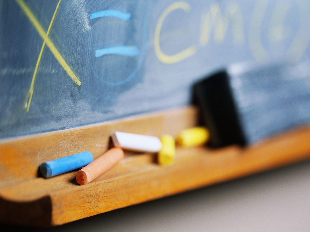 Меловоная доска и цветные мелки рядом.